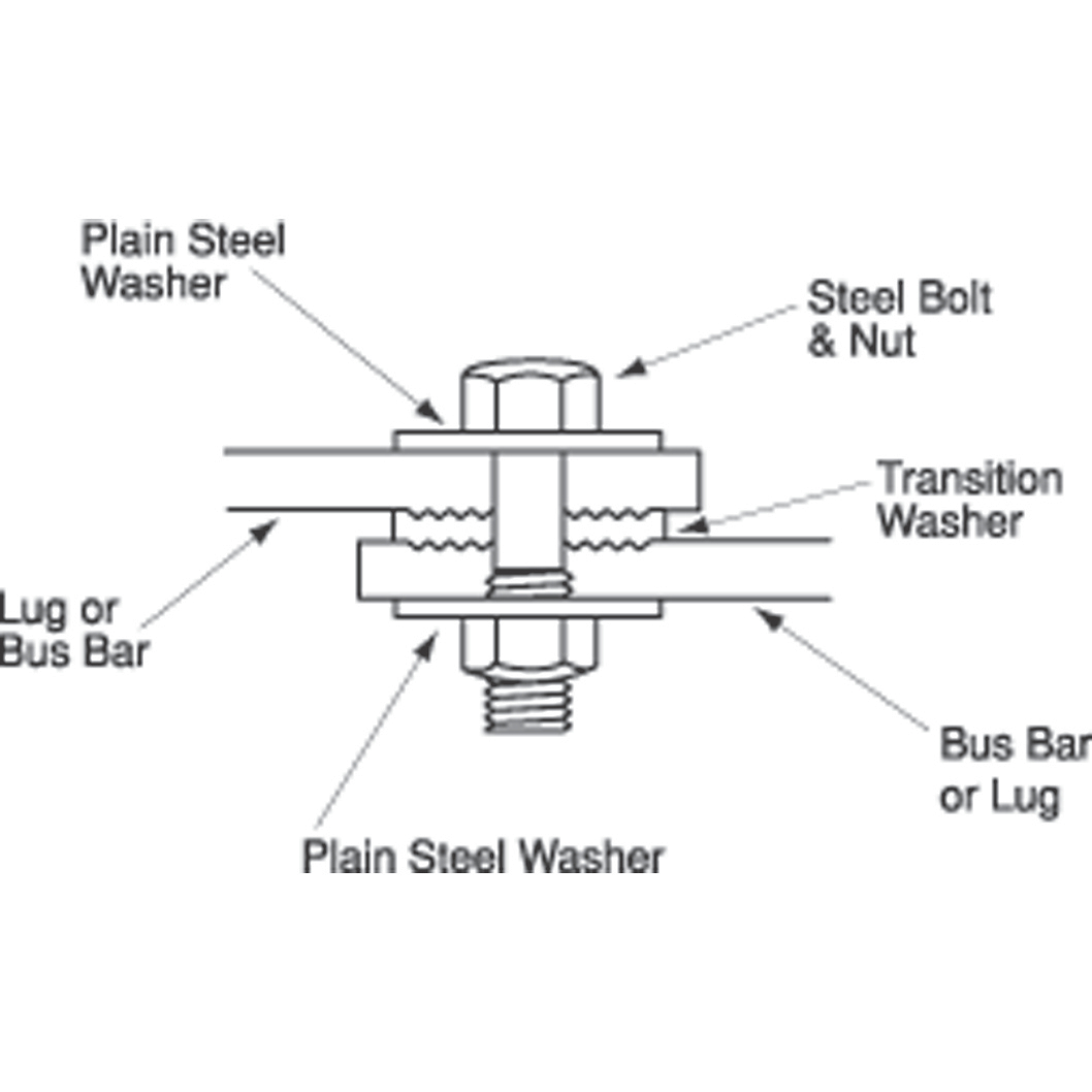 | Teeth on the transition washers penetrate aluminum and copper oxides, enabling copper to aluminum connections to be made in a bolted joint without the use of inhibiting compounds. |